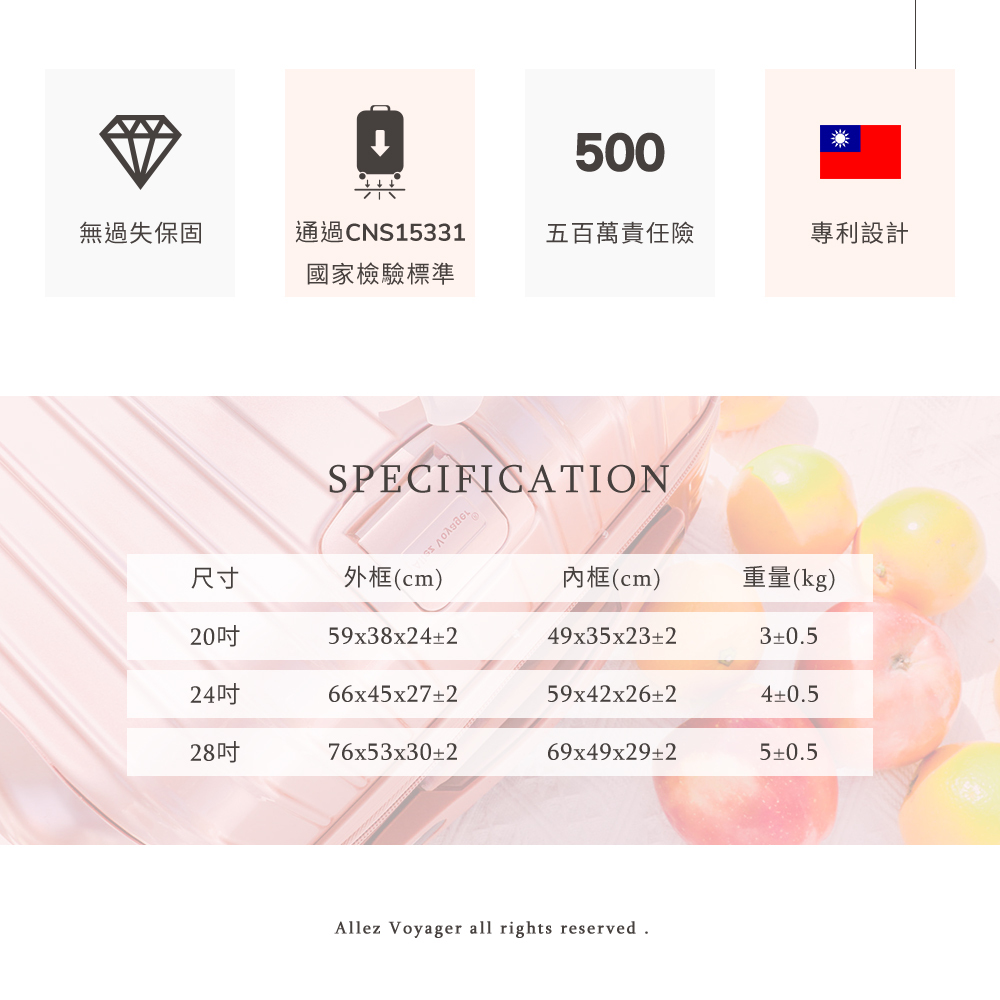 外框:約 76 x 53 x 30 (含輪子.把手.拉桿) ± 2 cm